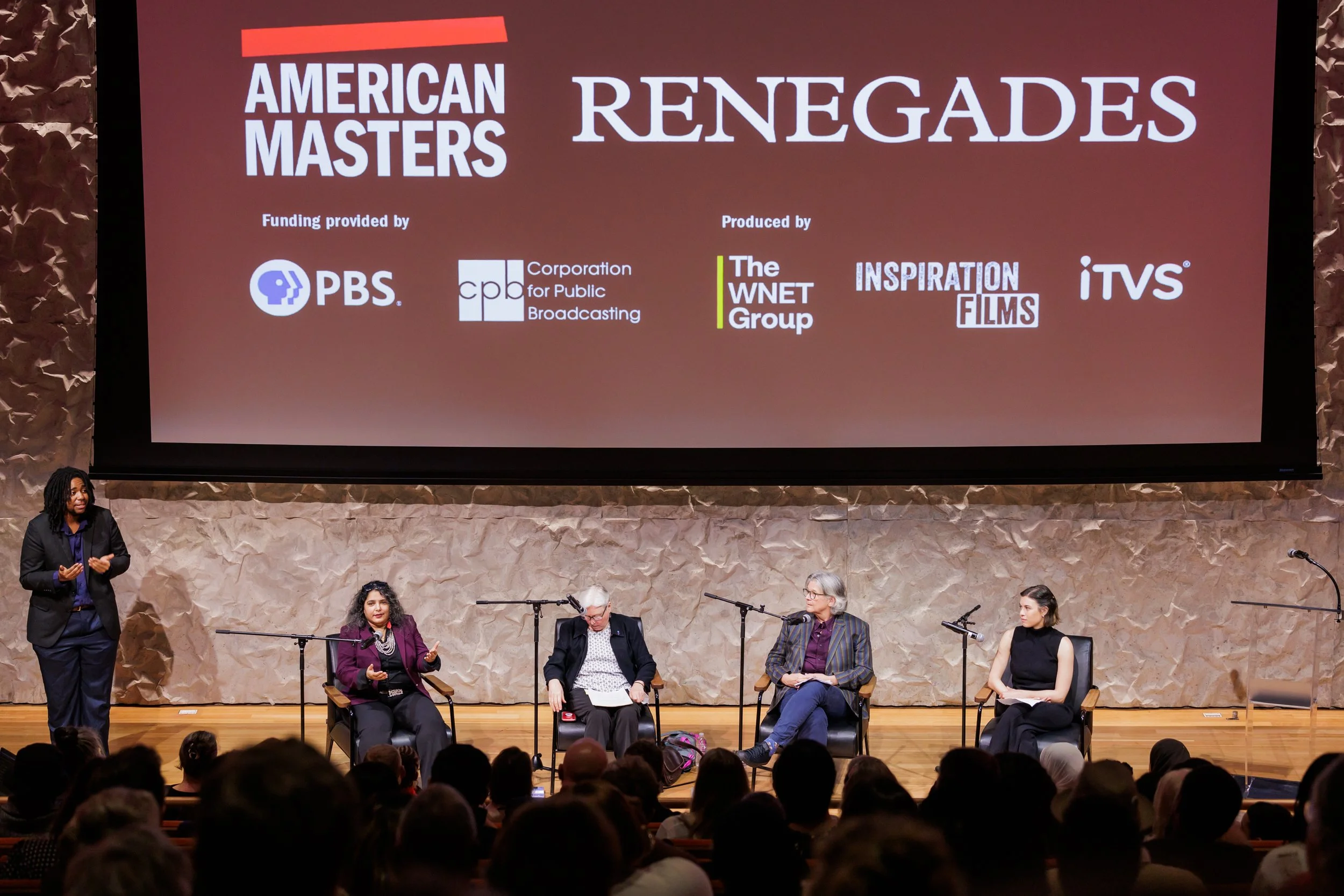 Panel discussion at The Kennedy Center premiere. Left to right: ASL interpreter; Day Al-Mohamed, Creator of RENEGADES; Beth Haller, Ph.D., Co-Director, Global Alliance for Disability in Media and Entertainment; Katherine Ott, Ph.D., Curator and Historian, Division of Medicine and Science, Smithsonian's National Museum of American History; Brianna Day, Manager, Disability Employee Resource Group, The Kennedy Center.